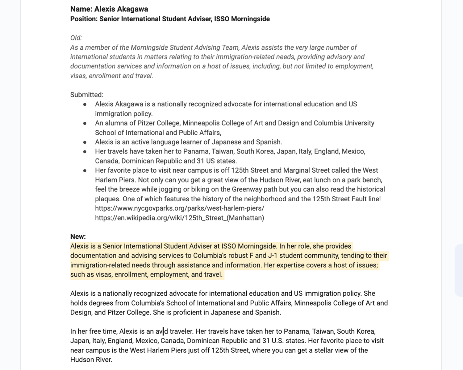 Once a bio was approved, I manually updated the staff member's profile on our website. This project was so successful that the office continues to use my model, submission form, spreadsheets, and checklists to craft the profiles of all new hires.